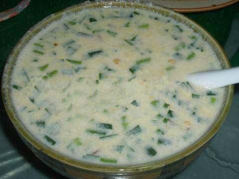 將用水浸泡過的黃豆用磨子磨碎,摻入切細的青菜葉,然后用溫火煮熟即可。此樣菜雖做法簡單,但營養(yǎng)價值極高且味鮮美,為當地人常用的一道菜。